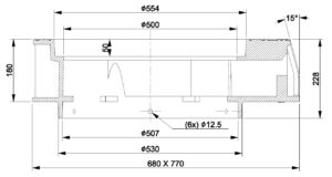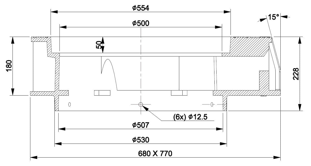 550/50 D400 3366205-N is a rectangular kita jaw frame for a round blind cover 3366021-N or grating 3366022-N. The frame is designed for Nordic conditions, in accordance with standard EN 124-2:2015, manufactured from grey cast iron EN-GJL-200 and is classified under Load Class D400.