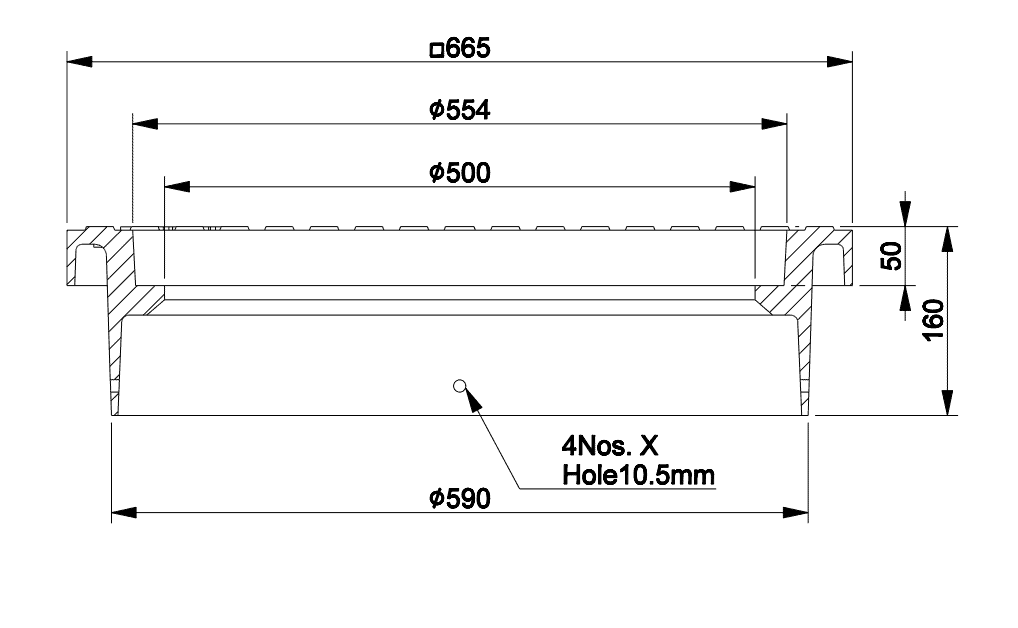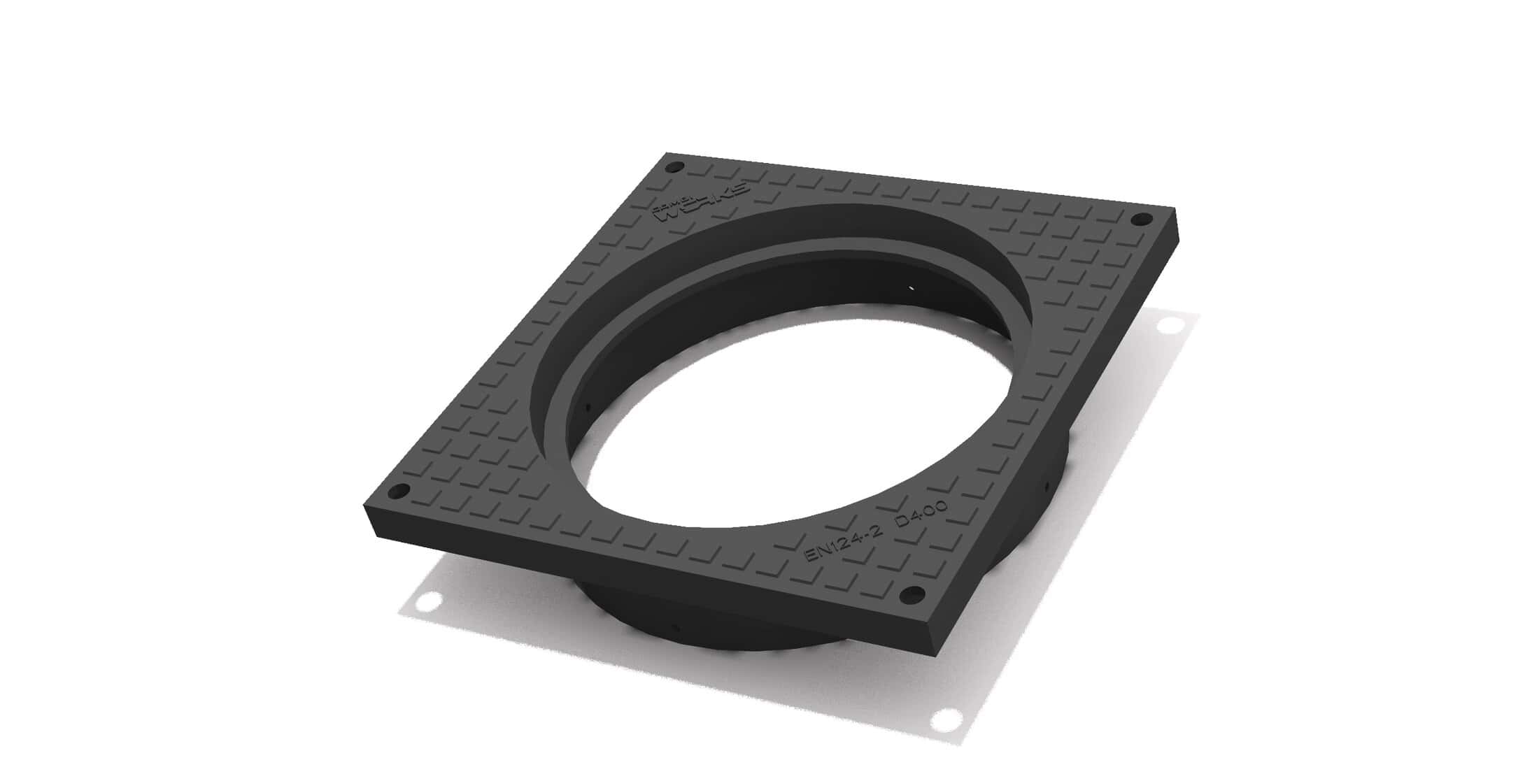 550/50-series 3366019-N is a floating type, square frame for round blind cover 3366021-N or grating 3366022-N. The frame is designed for Nordic conditions, in accordance with standard EN 124-2:2015, manufactured from grey cast iron EN-GJL-200 and is classified under Load Class D400.