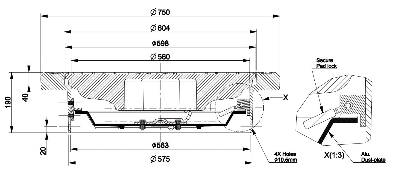 600 round frame and blind cover with padlock lockable dust plate