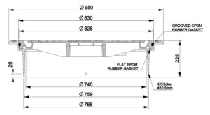 800-series E600 set 3366080G-N consists of a floating, round frame 3366178-N and a lockable, round blind cover 3366179-N with extra gasket on the outer edge of the cover. The set is designed for Nordic conditions, in accordance with standard EN 124-2:2015, manufactured from ductile iron EN-GJS-500/7 and is classified under Load Class E600.