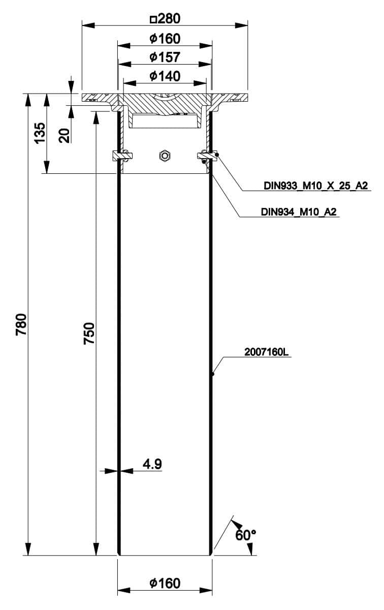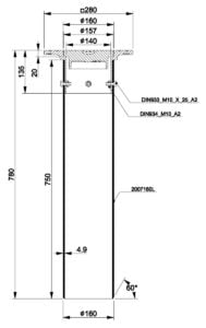 2001682-WSQ telescope set for valves consists of a floating, square frame 3366082-WSQ manhole cover set, DN160 x 4,9mm x 0,75m SN2 telescope pipe and M10 bolts and nuts. The set is designed for Nordic conditions and manufactured from grey cast iron EN-GJL-200 and taking max load 400kN.