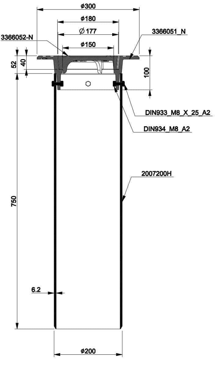 160/200-series Telescope set 2002008C-N consists of a floating, round frame 3366051-N, round blind cover 3366052-N and a 200/750 mm telescope pipe. The set is designed for Nordic conditions, in accordance with standard EN 124-2:2015, frame and blind cover are manufactured from ductile iron EN-GJS-500/7 and classified under Load Class D400.