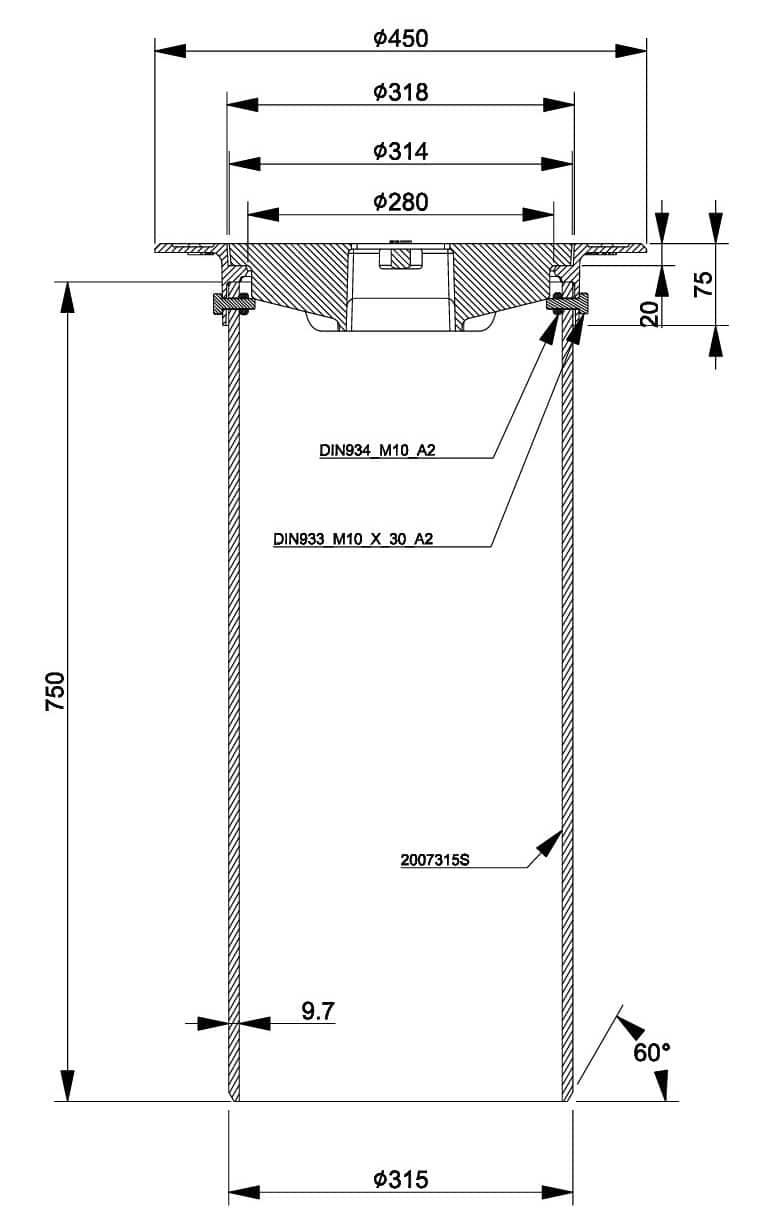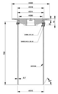 315-series Optimized telescope set 2003188G consists of a floating manhole cover 3366131/3-N set, DN315 x 9,7mm x 0,75m SN2 telescope pipe and M10 bolts and nuts. The set is designed for Nordic conditions, in accordance with standard EN 124-2:2015 . Frame and grating are manufactured from ductile iron EN-GJS-500/7 and classified under Load Class D400, pipe from PE and bolts and nuts from A2 stainless steel.