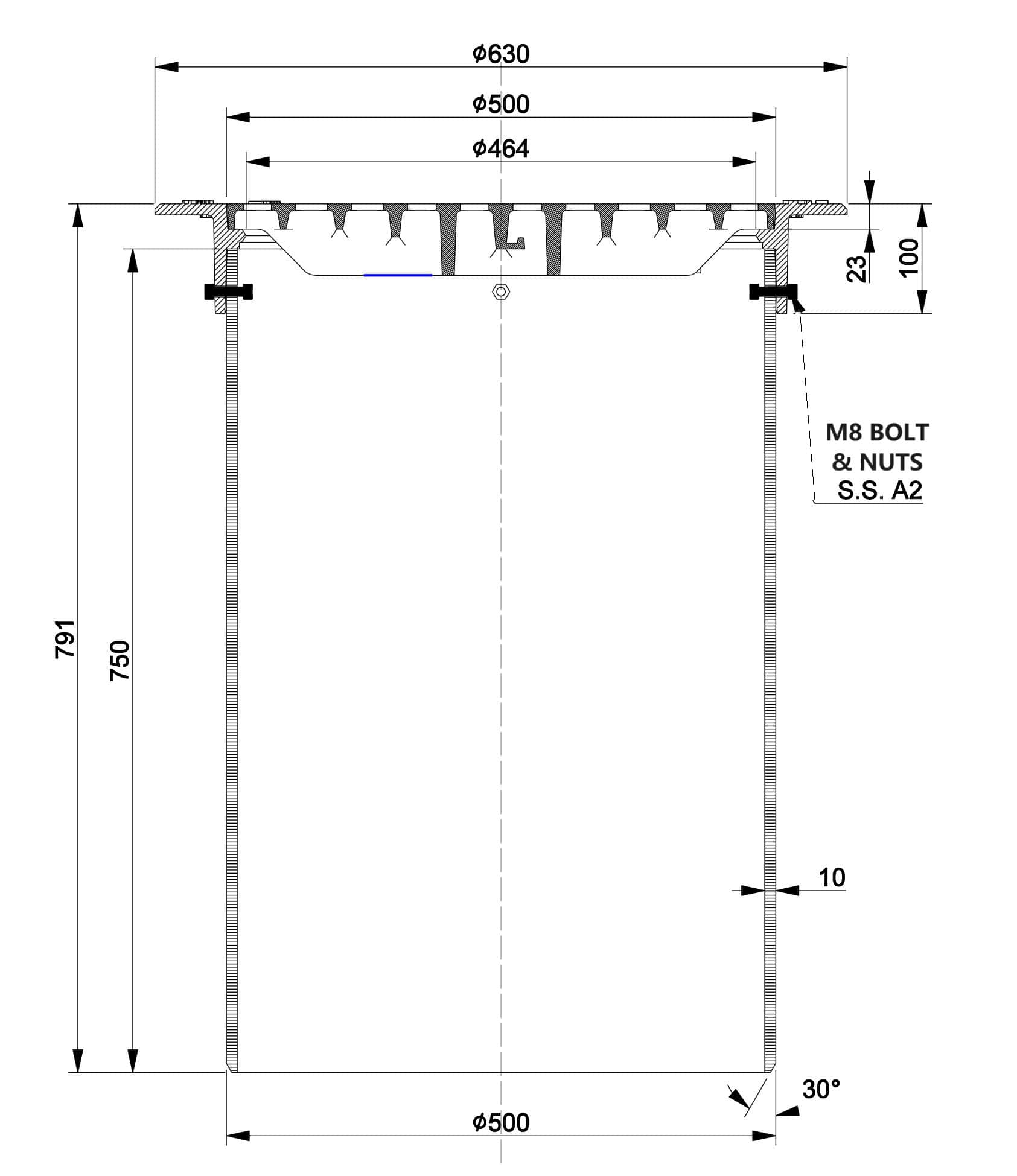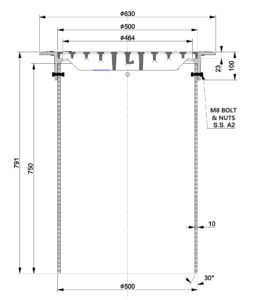 500-series Telescope set 2005108G-N consists of a floating, round frame 3366070-N, round grating 3366072-N and a 500/750 mm telescope pipe. The set is designed for Nordic conditions, in accordance with standard EN 124-2:2015, frame and blind cover are manufactured from ductile iron EN-GJS-500/7 and classified under Load Class D400.