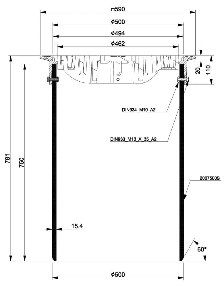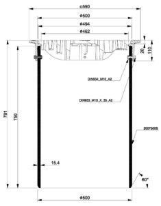 500-series Normal Telescope set 2005038G consists of a floating manhole cover 3366186/33-N set, DN500 x 15,3mm x 0,75m SN2 telescope pipe and M10 bolts and nuts. The set is designed for Nordic conditions, in accordance with standard EN 124-2:2015. Frame is manufactured from ductile iron EN-GJS-500/7 and grating grey cast iron EN-GJL-200 and classified under Load Class D400, pipe is from PE and bolts and nuts from A2 stainless steel.