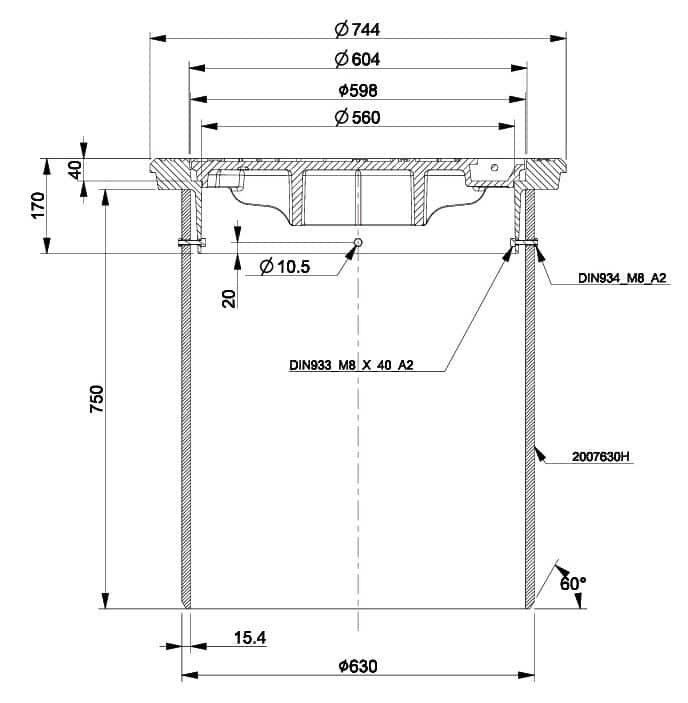 600/40-series Telescope set 2006568C-N consists of a floating, round frame 3366076-N, round blind cover 3366077-N and a 630/750 mm telescope pipe. The set is designed for Nordic conditions, in accordance with standard EN 124-2:2015, frame and blind cover are manufactured from grey cast iron EN-GJL-200 and classified under Load Class D400.