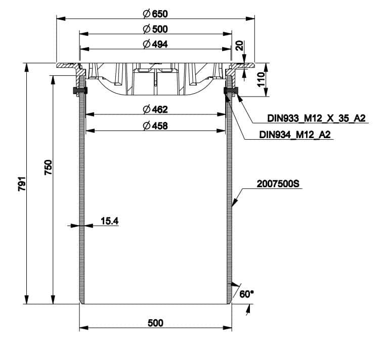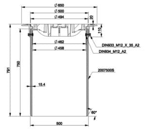 500-seeria ASTV teleskoobikomplekt 2005068G koosneb ujuvast ümmargusest 3366031/3-N kaevuluugi komplektist, DN500 x 15,3mm x 0,75m SN2 teleskooptorust ning M12 poldidest ja mutritest. Komplekt on sobiv Põhjamaade tingimustesse, vastab standardile EN 124-2:2015. Raam ja restluuk on valmistatud hallmalmist EN-GJL-200 ja klassifitseerub koormusklassi D400 alla, toru on PE-st ning poldid ja mutrid A2 roostevabast terasest.