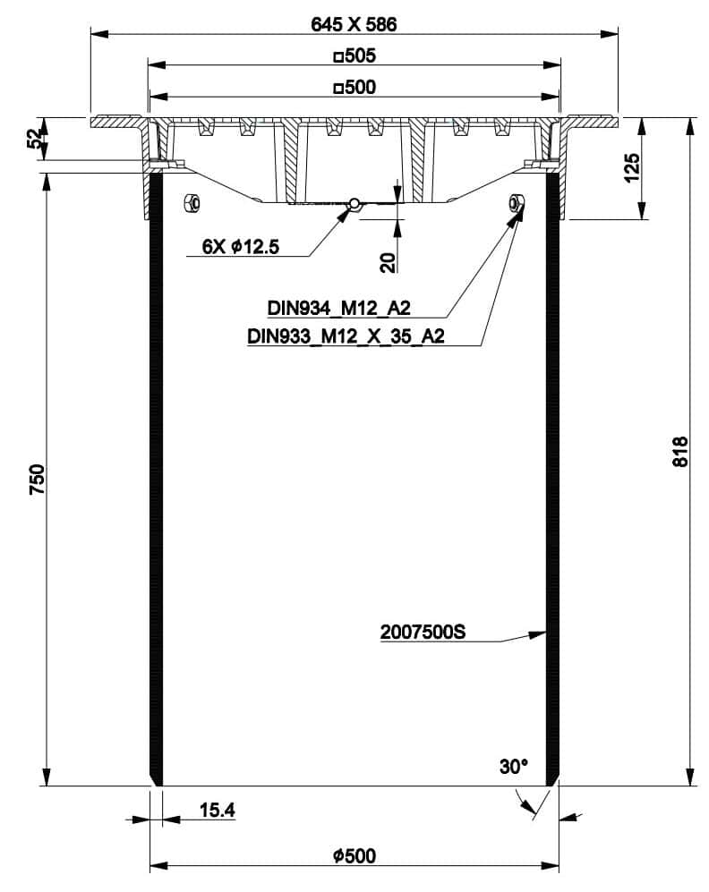 500-seeria Normal teleskoobikomplekt 2005048G koosneb 500×500 neljakandilisest ujuvraami ja neljakandilise restluugi komplektist 3366184/185-N , DN500 x 15,3mm x 0,75m SN2 teleskooptorust ning M10 poldidest ja mutritest. Komplekt on sobiv Põhjamaade tingimustesse, vastab standardile EN 124-2:2015. Raam ja restluuk on valmistatud keragrafiitmalmist EN-GJS-500/7 ja klassifitseerub koormusklassi D400 alla, toru on PE-st ning poldid ja mutrid A2 roostevabast terasest.